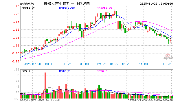11月25日,机器人产业ETF(560630)涨0.39%,成交额774.73万元。当日份额减少100.00万份,最新份额为2.51亿份,近20个交易日份额增加0.00份。最新资产净值计算值为2.61亿元。