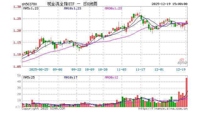 12月19日,现金流全指ETF(563780)涨0.90%,成交额5717.82万元。当日份额增加2500.00万份,最新份额为3.73亿份,近20个交易日份额增加6400.00万份。最新资产净值计算值为4.61亿元。