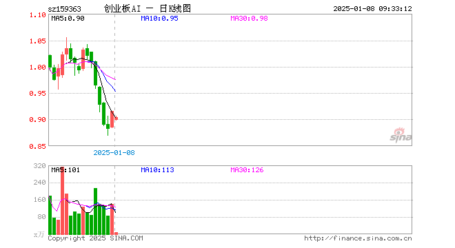 1月8日,创业板人工智能ETF华宝(159363)开盘跌1.86%,报0.899元。创业板人工智能ETF华宝(159363)重仓股方面,新易盛开盘跌2.48%,中际旭创跌1.92%,软通动力跌0.97%,天孚通信跌3.12%,同花顺跌1.48%,润和软件跌0.27%,景嘉微跌2.21%,网宿科技跌1.39%,蓝色光标跌1.08%,北京君正跌1.08%。