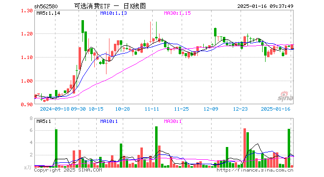 1月16日,可选消费ETF(562580)开盘跌0.87%,报1.133元。可选消费ETF(562580)重仓股方面,美的集团开盘涨0.23%,比亚迪涨0.00%,格力电器涨0.46%,海尔智家涨0.71%,福耀玻璃涨0.35%,中国中免涨0.13%,长安汽车涨0.32%,赛力斯涨0.07%,上汽集团涨0.00%,三花智控跌0.75%。