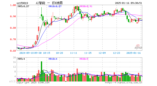 1月16日,人工智能ETF(159819)开盘涨0.46%,报0.880元。人工智能ETF(159819)重仓股方面,中际旭创开盘涨1.21%,海康威视涨0.14%,新易盛涨1.16%,韦尔股份涨0.55%,科大讯飞涨1.05%,中科曙光涨0.00%,澜起科技涨1.06%,金山办公涨0.27%,寒武纪跌1.14%,紫光股份涨0.79%。