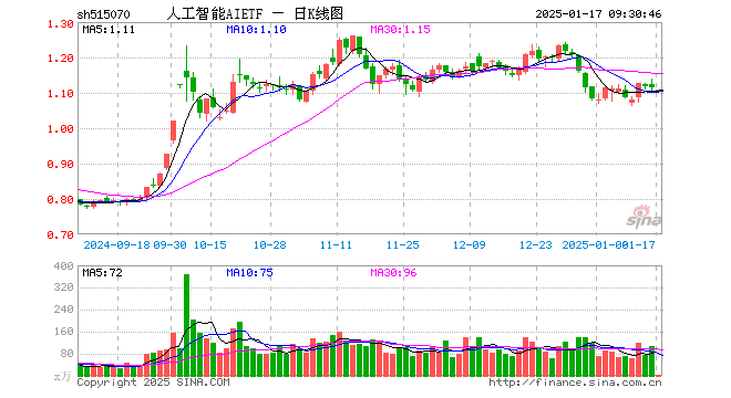 1月17日,人工智能AIETF(515070)开盘跌0.90%,报1.103元。人工智能AIETF(515070)重仓股方面,中际旭创开盘涨0.43%,海康威视跌0.39%,新易盛跌1.01%,韦尔股份跌0.80%,科大讯飞跌0.81%,中科曙光跌0.63%,金山办公跌0.30%,澜起科技跌0.64%,寒武纪跌2.86%,紫光股份跌0.32%。