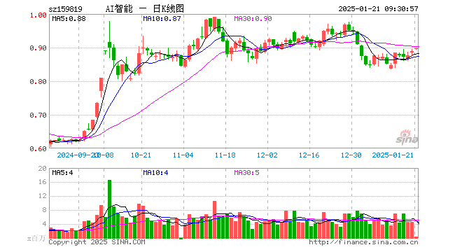 1月21日,人工智能ETF(159819)开盘涨0.79%,报0.895元。人工智能ETF(159819)重仓股方面,中际旭创开盘涨2.38%,海康威视涨0.46%,新易盛涨6.54%,韦尔股份涨0.30%,科大讯飞涨0.59%,中科曙光涨0.40%,澜起科技涨1.10%,金山办公涨0.14%,寒武纪涨0.00%,紫光股份涨0.74%。
