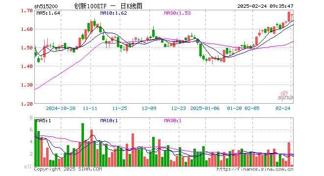 2月24日,创新100ETF(515200)开盘跌0.95%,报1.671元。创新100ETF(515200)重仓股方面,比亚迪开盘涨0.52%,恒瑞医药涨0.25%,迈瑞医疗涨0.85%,海光信息跌0.69%,中兴通讯跌1.13%,汇川技术涨0.45%,北方华创跌0.00%,海康威视跌1.62%,中国中车涨0.00%,国电南瑞涨0.17%。
