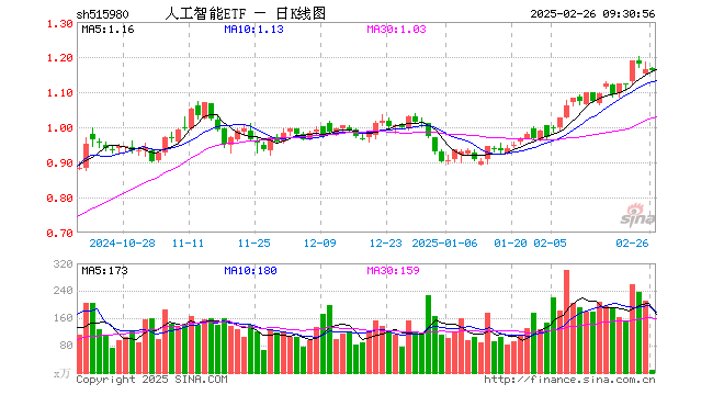 2月26日,人工智能ETF(515980)开盘涨0.09%,报1.166元。人工智能ETF(515980)重仓股方面,中际旭创开盘跌0.53%,中科曙光涨0.78%,寒武纪跌1.17%,科大讯飞涨0.09%,韦尔股份涨0.21%,金山办公涨0.32%,新易盛涨0.05%,澜起科技涨1.27%,紫光股份涨0.09%,浪潮信息涨0.06%。