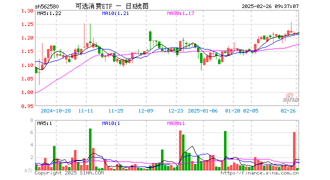 2月26日,可选消费ETF(562580)开盘跌0.16%,报1.213元。可选消费ETF(562580)重仓股方面,美的集团开盘跌0.46%,比亚迪涨0.00%,格力电器涨0.00%,海尔智家涨0.00%,福耀玻璃涨0.00%,赛力斯跌0.77%,上汽集团涨0.41%,长安汽车跌0.07%,中国中免涨0.10%,三花智控跌0.88%。