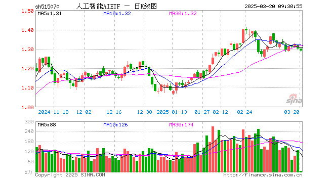 3月20日,人工智能AIETF(515070)开盘跌0.08%,报1.300元。人工智能AIETF(515070)重仓股方面,寒武纪开盘跌0.55%,海康威视涨0.03%,中际旭创涨0.30%,中科曙光涨0.00%,科大讯飞跌0.16%,韦尔股份跌0.01%,新易盛涨0.71%,澜起科技涨0.18%,金山办公涨0.29%,紫光股份跌0.31%。