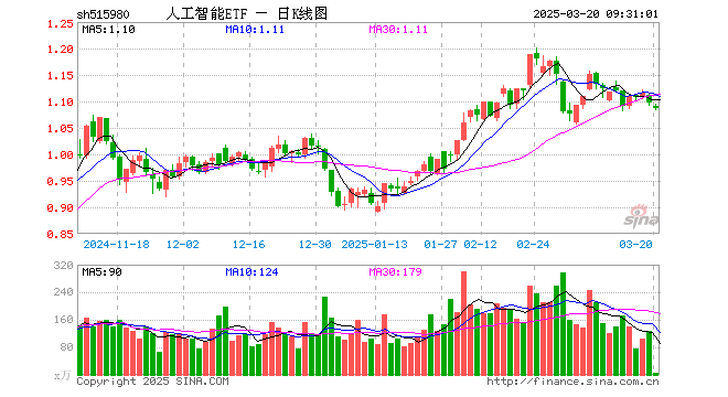 3月20日,人工智能ETF(515980)开盘跌0.46%,报1.091元。人工智能ETF(515980)重仓股方面,中际旭创开盘涨0.30%,中科曙光涨0.00%,寒武纪跌0.55%,科大讯飞跌0.16%,韦尔股份跌0.01%,金山办公涨0.29%,新易盛涨0.71%,澜起科技涨0.18%,紫光股份跌0.31%,浪潮信息跌0.10%。