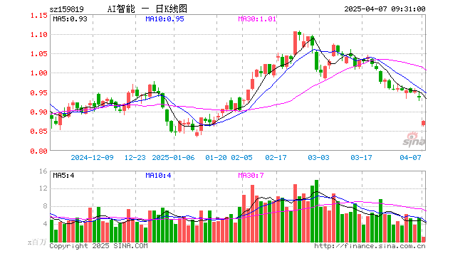 4月7日,人工智能ETF(159819)开盘跌7.49%,报0.865元。人工智能ETF(159819)重仓股方面,寒武纪开盘跌5.96%,海康威视跌4.38%,中际旭创跌14.68%,中科曙光跌6.52%,科大讯飞跌6.14%,韦尔股份跌8.21%,新易盛跌14.04%,澜起科技跌9.08%,金山办公跌4.76%,紫光股份跌7.21%。