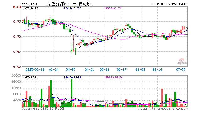 7月7日,绿色能源ETF(562010)开盘涨0.14%,报0.730元。绿色能源ETF(562010)重仓股方面,比亚迪开盘跌0.54%,长江电力涨0.27%,宁德时代涨0.00%,阳光电源跌0.44%,隆基绿能跌0.77%,亿纬锂能跌0.45%,通威股份跌1.69%,华友钴业跌0.11%,赣锋锂业跌0.38%,川投能源涨0.49%。