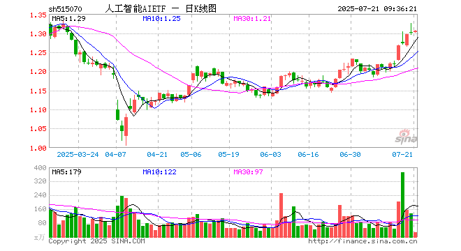 7月21日,人工智能AIETF(515070)开盘涨0.00%,报1.302元。人工智能AIETF(515070)重仓股方面,寒武纪开盘涨0.75%,海康威视涨0.25%,韦尔股份跌0.56%,中科曙光跌0.01%,澜起科技跌0.42%,中际旭创跌0.40%,科大讯飞涨0.25%,新易盛涨1.38%,金山办公跌0.68%,紫光股份跌0.32%。