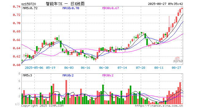 8月27日,智能车ETF泰康(159720)开盘涨0.14%,报0.733元。智能车ETF泰康(159720)重仓股方面,宁德时代开盘跌0.17%,比亚迪涨0.18%,立讯精密跌1.27%,汇川技术涨0.42%,豪威集团涨2.38%,长城汽车跌0.38%,科大讯飞涨3.75%,长安汽车涨0.00%,三花智控跌0.13%,亿纬锂能涨0.00%。