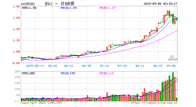 9月8日,创业板人工智能ETF华夏(159381)开盘跌0.63%,报1.578元。创业板人工智能ETF华夏(159381)重仓股方面,中际旭创开盘跌3.19%,新易盛跌2.65%,天孚通信跌2.56%,软通动力跌0.22%,润泽科技涨0.17%,全志科技涨0.36%,景嘉微跌0.80%,深信服涨0.77%,北京君正跌0.35%,网宿科技跌0.63%。