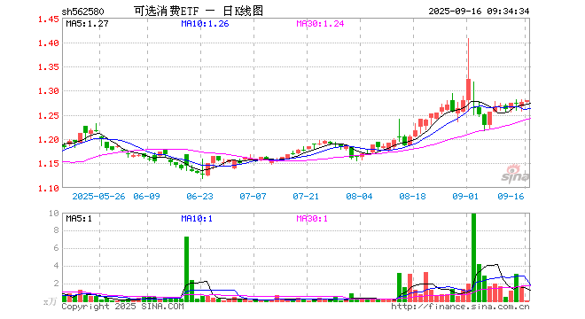 9月16日,可选消费ETF(562580)开盘涨0.00%,报1.276元。可选消费ETF(562580)重仓股方面,美的集团开盘跌0.05%,比亚迪涨0.28%,格力电器跌0.12%,赛力斯涨0.35%,海尔智家涨0.12%,福耀玻璃涨0.35%,上汽集团涨0.21%,长安汽车跌0.24%,中国中免涨0.80%,三花智控涨1.46%。