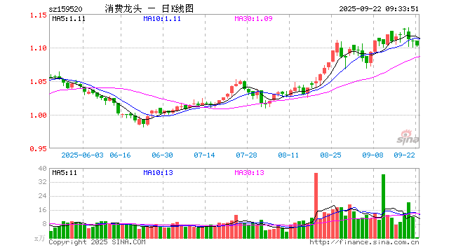 9月22日,消费龙头ETF(159520)开盘涨0.00%,报1.110元。消费龙头ETF(159520)重仓股方面,贵州茅台开盘跌0.20%,格力电器跌0.35%,伊利股份涨0.00%,牧原股份跌0.99%,赛力斯涨0.21%,海尔智家跌0.61%,福耀玻璃涨0.19%,温氏股份跌0.05%,山西汾酒跌1.53%,分众传媒跌0.60%。
