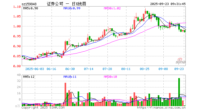 9月23日,证券ETF基金(159848)开盘跌0.10%,报0.979元。证券ETF基金(159848)重仓股方面,东方财富开盘跌1.19%,中信证券跌0.52%,国泰海通跌0.64%,华泰证券跌0.65%,招商证券跌0.41%,东方证券跌0.67%,广发证券跌0.58%,申万宏源跌0.39%,兴业证券跌0.31%,中金公司跌0.44%。