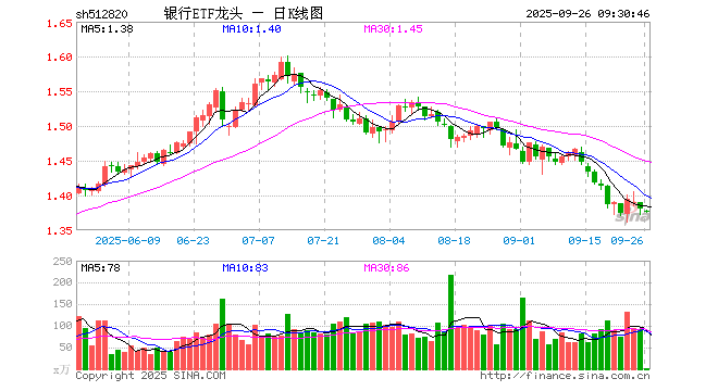 9月26日,银行ETF龙头(512820)开盘跌0.22%,报1.378元。银行ETF龙头(512820)重仓股方面,招商银行开盘跌0.02%,兴业银行涨0.20%,工商银行跌0.41%,交通银行跌0.15%,农业银行跌0.30%,江苏银行跌0.10%,浦发银行跌0.48%,民生银行跌0.25%,平安银行跌0.09%,上海银行涨0.22%。