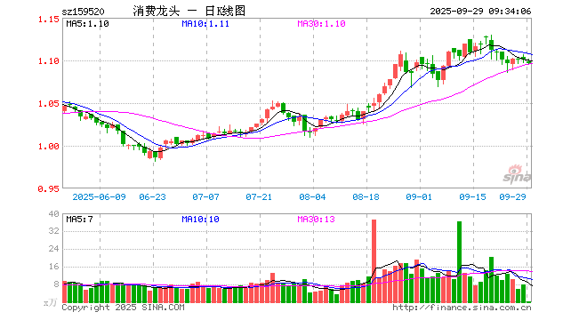 9月29日,消费龙头ETF(159520)开盘跌0.18%,报1.098元。消费龙头ETF(159520)重仓股方面,贵州茅台开盘涨0.31%,格力电器涨0.00%,伊利股份涨0.00%,牧原股份跌1.28%,赛力斯涨0.50%,海尔智家跌0.23%,福耀玻璃跌0.44%,温氏股份跌0.32%,山西汾酒跌0.17%,分众传媒跌0.36%。