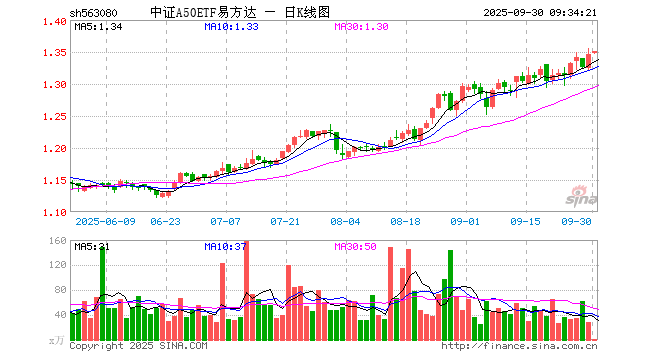 9月30日,中证A50ETF易方达(563080)开盘涨0.15%,报1.348元。中证A50ETF易方达(563080)重仓股方面,贵州茅台开盘跌0.06%,宁德时代跌0.34%,中国平安跌0.37%,招商银行跌0.07%,长江电力涨0.18%,美的集团跌0.04%,紫金矿业涨3.57%,比亚迪跌0.39%,中信证券跌0.43%,恒瑞医药跌0.29%。