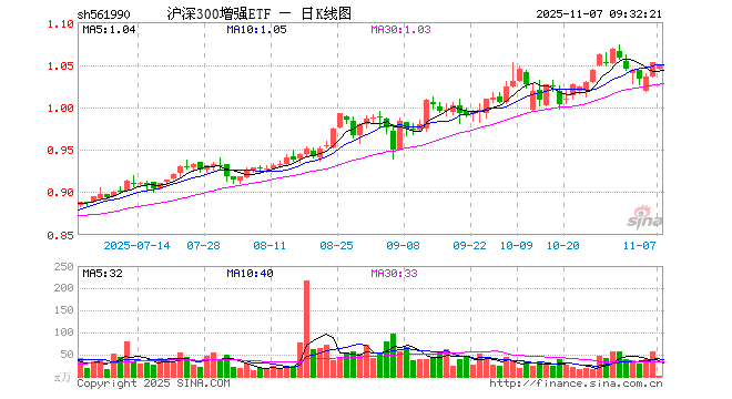 11月7日,沪深300增强ETF(561990)开盘跌0.67%,报1.045元。沪深300增强ETF(561990)重仓股方面,宁德时代开盘跌0.30%,中国平安跌0.20%,贵州茅台跌0.00%,紫金矿业跌0.03%,美的集团涨0.31%,兴业银行涨0.57%,寒武纪跌1.65%,农业银行涨0.25%,中际旭创跌1.18%,工商银行涨0.00%。