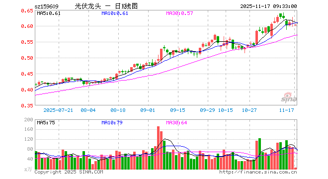 11月17日,光伏龙头ETF(159609)开盘跌1.15%,报0.600元。光伏龙头ETF(159609)重仓股方面,阳光电源开盘跌1.33%,隆基绿能涨0.55%,特变电工跌0.46%,TCL科技涨0.00%,通威股份跌1.16%,正泰电器跌0.55%,罗博特科跌0.51%,晶盛机电跌0.03%,捷佳伟创跌1.09%,TCL中环跌0.09%。
