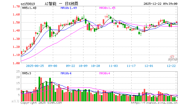 12月22日,人工智能ETF(159819)开盘涨1.02%,报1.491元。人工智能ETF(159819)重仓股方面,新易盛开盘涨3.88%,中际旭创涨3.20%,寒武纪涨0.55%,澜起科技涨0.80%,中科曙光涨1.33%,科大讯飞涨0.29%,豪威集团涨0.26%,海康威视涨0.21%,浪潮信息涨0.93%,金山办公跌0.20%。