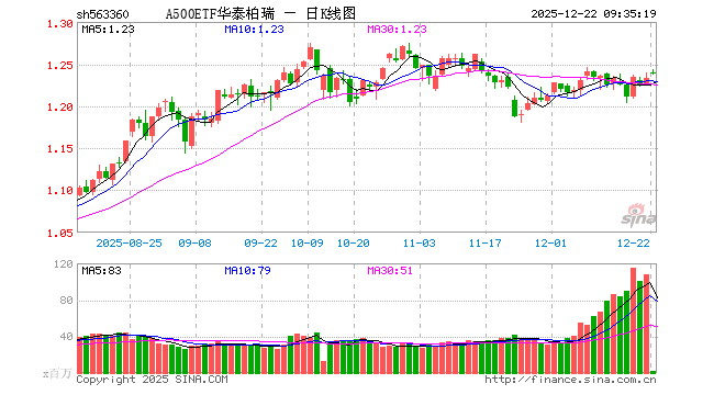 12月22日,A500ETF华泰柏瑞(563360)开盘涨0.57%,报1.240元。A500ETF华泰柏瑞(563360)重仓股方面,宁德时代开盘涨0.53%,贵州茅台涨0.00%,中国平安跌0.07%,招商银行涨0.21%,紫金矿业涨1.83%,美的集团跌0.19%,新易盛涨3.88%,中际旭创涨3.20%,东方财富跌0.09%,长江电力跌0.04%。