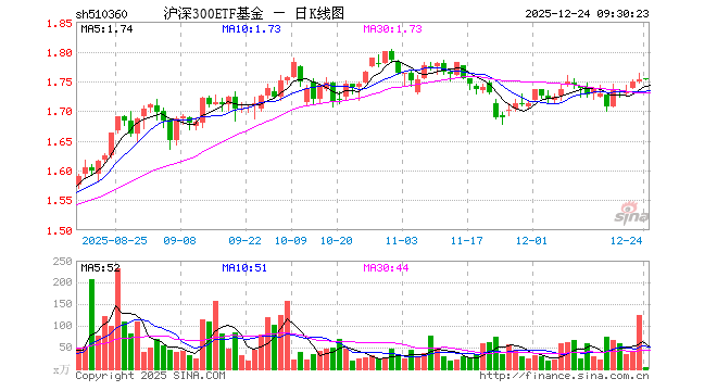 12月24日,沪深300ETF基金(510360)开盘涨0.11%,报1.754元。沪深300ETF基金(510360)重仓股方面,宁德时代开盘跌0.01%,贵州茅台跌0.20%,中国平安跌0.46%,招商银行涨0.05%,紫金矿业涨1.40%,新易盛涨0.43%,中际旭创涨1.07%,美的集团跌0.28%,东方财富跌0.30%,长江电力跌0.04%。