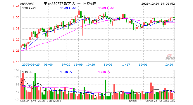 12月24日,中证A50ETF易方达(563080)开盘涨0.00%,报1.349元。中证A50ETF易方达(563080)重仓股方面,宁德时代开盘跌0.01%,贵州茅台跌0.20%,中国平安跌0.46%,招商银行涨0.05%,紫金矿业涨1.40%,美的集团跌0.28%,长江电力跌0.04%,立讯精密涨0.22%,恒瑞医药跌0.21%,比亚迪跌0.01%。
