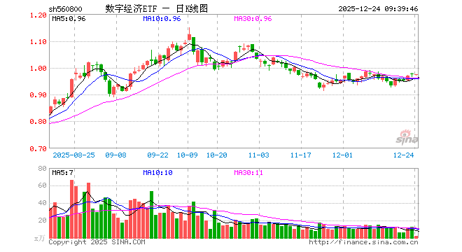 12月24日,数字经济ETF(560800)开盘涨0.10%,报0.975元。数字经济ETF(560800)重仓股方面,东方财富开盘跌0.30%,中芯国际涨2.17%,寒武纪跌0.08%,海光信息跌0.24%,北方华创跌0.09%,澜起科技跌0.41%,中科曙光涨0.01%,汇川技术跌0.10%,兆易创新涨1.21%。