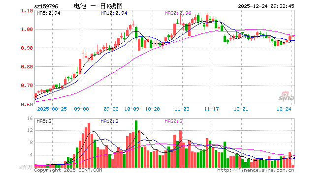 12月24日,电池50ETF(159796)开盘跌0.10%,报0.957元。电池50ETF(159796)重仓股方面,阳光电源开盘跌1.12%,宁德时代跌0.01%,亿纬锂能跌0.49%,三花智控涨0.00%,先导智能跌1.15%,国轩高科跌0.31%,天赐材料涨0.02%,欣旺达跌0.70%,格林美涨1.40%,科达利跌0.01%。