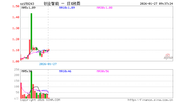 1月27日,创业板人工智能ETF招商(159243)开盘跌0.36%,报1.096元。创业板人工智能ETF招商(159243)重仓股方面,中际旭创开盘涨0.03%,新易盛跌0.28%,天孚通信涨0.84%,同花顺跌0.15%,润和软件跌0.28%,北京君正跌1.47%,润泽科技跌0.78%,昆仑万维涨1.20%,蓝色光标涨0.00%,长芯博创跌2.25%。