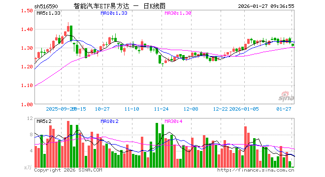 1月27日,智能汽车ETF易方达(516590)开盘跌0.53%,报1.318元。智能汽车ETF易方达(516590)重仓股方面,宁德时代开盘涨0.83%,比亚迪涨0.04%,立讯精密涨0.43%,三花智控涨0.10%,汇川技术跌0.25%,赛力斯涨0.06%,豪威集团跌0.10%,亿纬锂能跌0.76%,拓普集团跌0.18%,华友钴业跌1.12%。