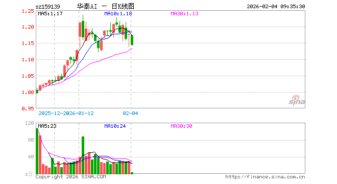 2月4日,科创创业人工智能ETF华泰柏瑞(159139)开盘跌0.26%,报1.173元。科创创业人工智能ETF华泰柏瑞(159139)重仓股方面,新易盛开盘跌4.45%,中际旭创跌3.34%,澜起科技跌3.53%,寒武纪跌2.48%,金山办公跌1.39%,芯原股份跌1.00%,润泽科技跌2.71%,昆仑万维涨7.41%,协创数据跌1.80%,北京君正跌1.79%。