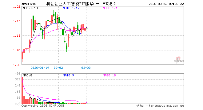 3月3日,科创创业人工智能ETF鹏华(588410)开盘跌0.09%,报1.125元。科创创业人工智能ETF鹏华(588410)重仓股方面,中际旭创开盘涨0.04%,新易盛涨0.00%,澜起科技涨0.39%,寒武纪涨0.43%,金山办公涨0.03%,芯原股份涨0.60%,润泽科技涨2.35%,北京君正涨0.54%,昆仑万维跌1.69%,协创数据跌0.88%。