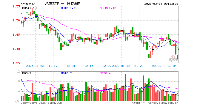 3月4日,汽车ETF(159512)开盘跌0.14%,报1.378元。汽车ETF(159512)重仓股方面,比亚迪开盘跌0.01%,赛力斯跌1.86%,江淮汽车跌1.01%,上汽集团跌0.64%,长安汽车跌1.09%,宇通客车跌0.17%,长城汽车跌0.79%,北汽蓝谷涨0.00%,广汽集团跌0.38%,福田汽车跌1.32%。