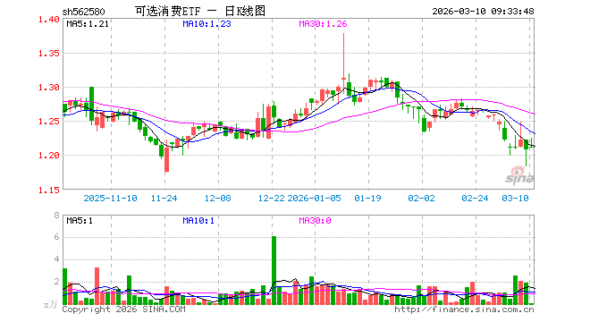 3月10日,可选消费ETF(562580)开盘涨0.33%,报1.212元。可选消费ETF(562580)重仓股方面,美的集团开盘涨0.45%,比亚迪跌0.35%,格力电器涨0.11%,三花智控涨1.38%,福耀玻璃涨0.50%,赛力斯涨1.23%,海尔智家涨0.78%,中国中免涨0.95%,上汽集团涨0.36%,拓普集团涨1.41%。