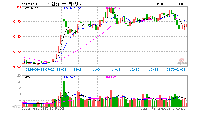 1月9日,截止午间收盘,人工智能ETF(159819)涨0.69%,报0.876元,成交额2.00亿元。人工智能ETF(159819)重仓股方面,中际旭创截止午盘跌1.80%,海康威视涨0.50%,新易盛跌2.14%,韦尔股份跌0.48%,科大讯飞涨0.86%,中科曙光涨1.19%,澜起科技涨0.55%,金山办公涨2.34%,寒武纪跌0.30%,紫光股份涨3.11%。