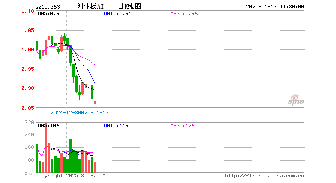 1月13日,截止午间收盘,创业板人工智能ETF华宝(159363)跌0.69%,报0.867元,成交额6022.71万元。创业板人工智能ETF华宝(159363)重仓股方面,新易盛截止午盘涨1.98%,中际旭创跌1.51%,软通动力跌0.46%,天孚通信跌1.55%,同花顺涨1.02%,润和软件涨0.69%,景嘉微跌3.08%,网宿科技涨1.95%,蓝色光标跌1.12%,北京君正涨0.10%。