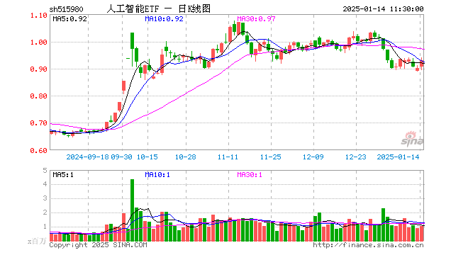 1月14日,截止午间收盘,人工智能ETF(515980)涨2.99%,报0.929元,成交额9582.85万元。人工智能ETF(515980)重仓股方面,中际旭创截止午盘涨1.84%,新易盛涨0.20%,科大讯飞涨3.26%,中科曙光涨3.76%,金山办公涨7.90%,韦尔股份涨3.38%,寒武纪跌3.76%,海康威视涨1.73%,德赛西威涨3.70%,澜起科技涨4.04%。