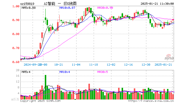 1月21日,截止午间收盘,人工智能ETF(159819)涨1.91%,报0.905元,成交额3.01亿元。人工智能ETF(159819)重仓股方面,中际旭创截止午盘涨1.44%,海康威视涨0.46%,新易盛涨4.99%,韦尔股份涨1.58%,科大讯飞涨0.67%,中科曙光涨1.17%,澜起科技涨3.54%,金山办公跌0.31%,寒武纪涨1.42%,紫光股份涨3.28%。