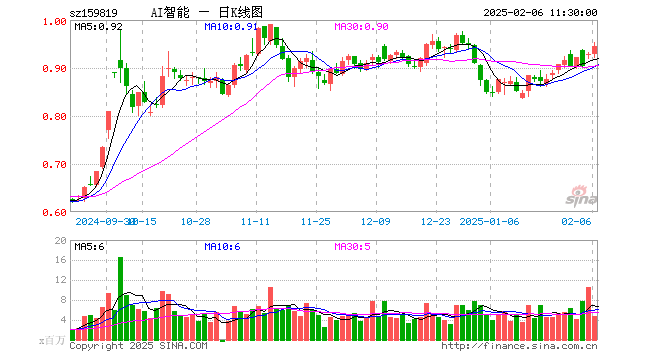 2月6日,截止午间收盘,人工智能ETF(159819)涨1.72%,报0.945元,成交额4.54亿元。人工智能ETF(159819)重仓股方面,寒武纪截止午盘跌1.93%,海康威视涨0.00%,中际旭创涨1.83%,中科曙光涨0.85%,科大讯飞涨0.11%,韦尔股份涨0.64%,新易盛涨4.06%,澜起科技涨2.54%,金山办公跌2.24%,紫光股份涨3.67%。