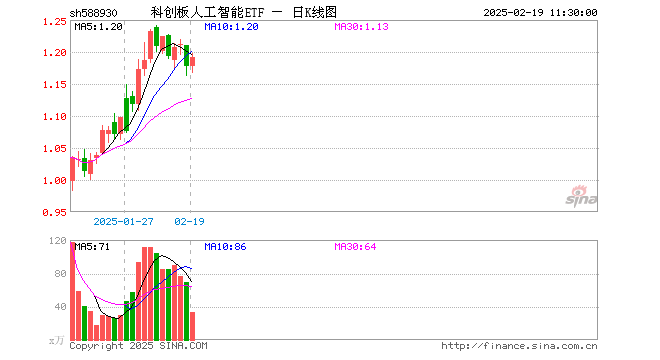 2月19日,截止午间收盘,科创板人工智能ETF(588930)涨1.27%,报1.192元,成交额3948.98万元。科创板人工智能ETF(588930)重仓股方面,寒武纪截止午盘跌0.68%,石头科技涨1.08%,澜起科技涨1.47%,金山办公涨1.69%,恒玄科技涨3.04%,晶晨股份涨1.95%,芯原股份涨3.30%,乐鑫科技涨2.36%,中科星图涨2.57%,复旦微电涨3.78%。