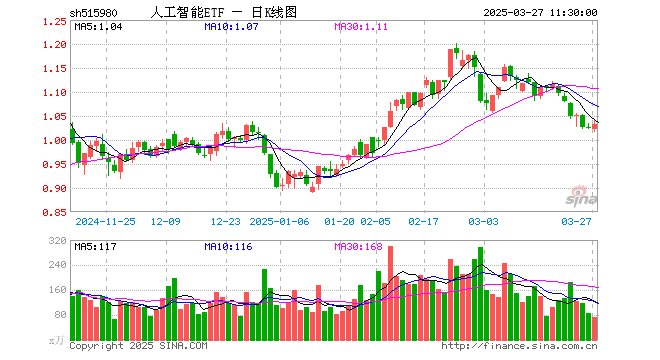 3月27日,截止午间收盘,人工智能ETF(515980)涨0.68%,报1.032元,成交额7461.93万元。人工智能ETF(515980)重仓股方面,中际旭创截止午盘跌1.34%,中科曙光涨1.03%,寒武纪涨0.25%,科大讯飞涨0.19%,韦尔股份涨0.97%,金山办公跌0.35%,新易盛跌2.03%,澜起科技涨2.93%,紫光股份涨1.03%,浪潮信息跌0.59%。