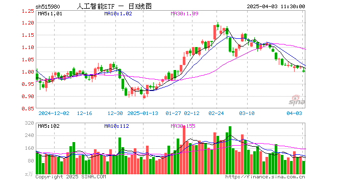 4月3日,截止午间收盘,人工智能ETF(515980)跌1.77%,报0.998元,成交额8005.21万元。人工智能ETF(515980)重仓股方面,中际旭创截止午盘跌4.83%,中科曙光跌0.79%,寒武纪涨2.18%,科大讯飞跌0.46%,韦尔股份跌2.49%,金山办公涨1.83%,新易盛跌7.20%,澜起科技跌2.86%,紫光股份跌2.22%,浪潮信息跌1.53%。