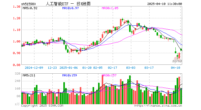 4月10日,截止午间收盘,人工智能ETF(515980)涨2.22%,报0.920元,成交额1.55亿元。人工智能ETF(515980)重仓股方面,中际旭创截止午盘涨8.72%,中科曙光涨0.57%,寒武纪跌2.14%,科大讯飞涨1.86%,韦尔股份涨2.27%,金山办公跌1.42%,新易盛涨9.86%,澜起科技涨2.47%,紫光股份涨4.60%,浪潮信息涨3.59%。