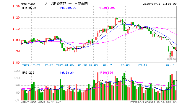 4月11日,截止午间收盘,人工智能ETF(515980)涨1.41%,报0.932元,成交额9627.27万元。人工智能ETF(515980)重仓股方面,中科曙光截止午盘涨0.75%,寒武纪涨2.47%,韦尔股份涨4.18%,中际旭创跌0.77%,科大讯飞涨0.32%,金山办公涨0.95%,新易盛跌1.13%,澜起科技涨7.17%,浪潮信息涨1.06%,紫光股份跌0.16%。