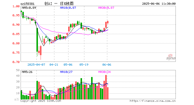 6月6日,截止午间收盘,创业板人工智能ETF华夏(159381)涨0.44%,报0.918元,成交额1867.27万元。创业板人工智能ETF华夏(159381)重仓股方面,新易盛截止午盘涨2.79%,中际旭创涨0.37%,软通动力涨0.13%,润泽科技涨1.72%,天孚通信涨2.07%,网宿科技涨0.84%,光环新网涨2.45%,全志科技涨1.55%,深信服涨3.00%,北京君正涨1.92%。