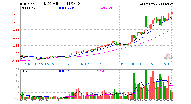 9月15日,截止午间收盘,创业板50ETF华夏(159367)涨2.28%,报1.523元,成交额634.40万元。创业板50ETF华夏(159367)重仓股方面,宁德时代截止午盘涨9.85%,东方财富涨1.74%,汇川技术涨1.86%,中际旭创跌2.64%,迈瑞医疗跌0.27%,新易盛跌2.30%,阳光电源涨5.88%,胜宏科技跌3.07%,亿纬锂能涨4.08%,同花顺涨2.43%。