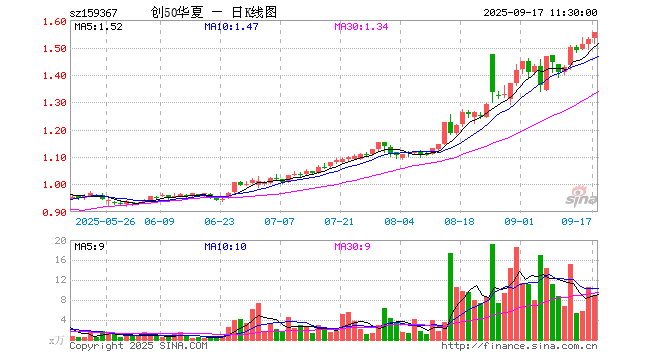 9月17日,截止午间收盘,创业板50ETF华夏(159367)涨1.50%,报1.553元,成交额1369.43万元。创业板50ETF华夏(159367)重仓股方面,宁德时代截止午盘涨6.48%,东方财富涨2.67%,汇川技术涨0.35%,中际旭创跌1.76%,迈瑞医疗跌0.28%,新易盛涨0.10%,阳光电源跌0.11%,胜宏科技跌4.82%,亿纬锂能涨0.67%,同花顺涨4.91%。
